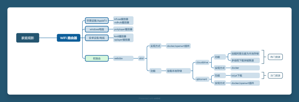在家里观影时,我采用如下所述的方式——我的核心软件是alist,而核心硬件则是软路由。简而言之,我通过alist将本地局域网共享和互联网的网盘资源整合在一起,形成一个webdav地址,然后通过视频播放器读取这个地址。