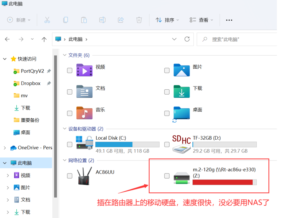电脑访问路由器上的移动硬盘很简单——直接在windows文件资源管理器——网络,可以找到那块移动硬盘。为了更方便,你可以可以右键这个移动硬盘——映射网络驱动器,例如设置为Z:盘,如此一来就跟访问本地硬盘一样方便了。(如上图所示)
