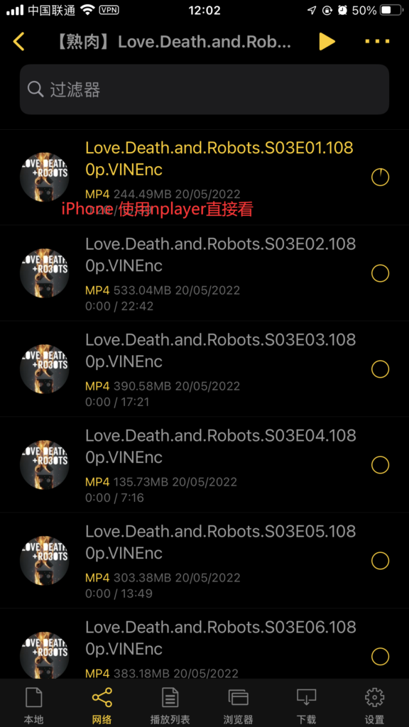 苹果手机和iPad系统,infuse、nplayer等优秀的播放器自然可以连接本地的网络共享硬盘,效果如上图显示。
